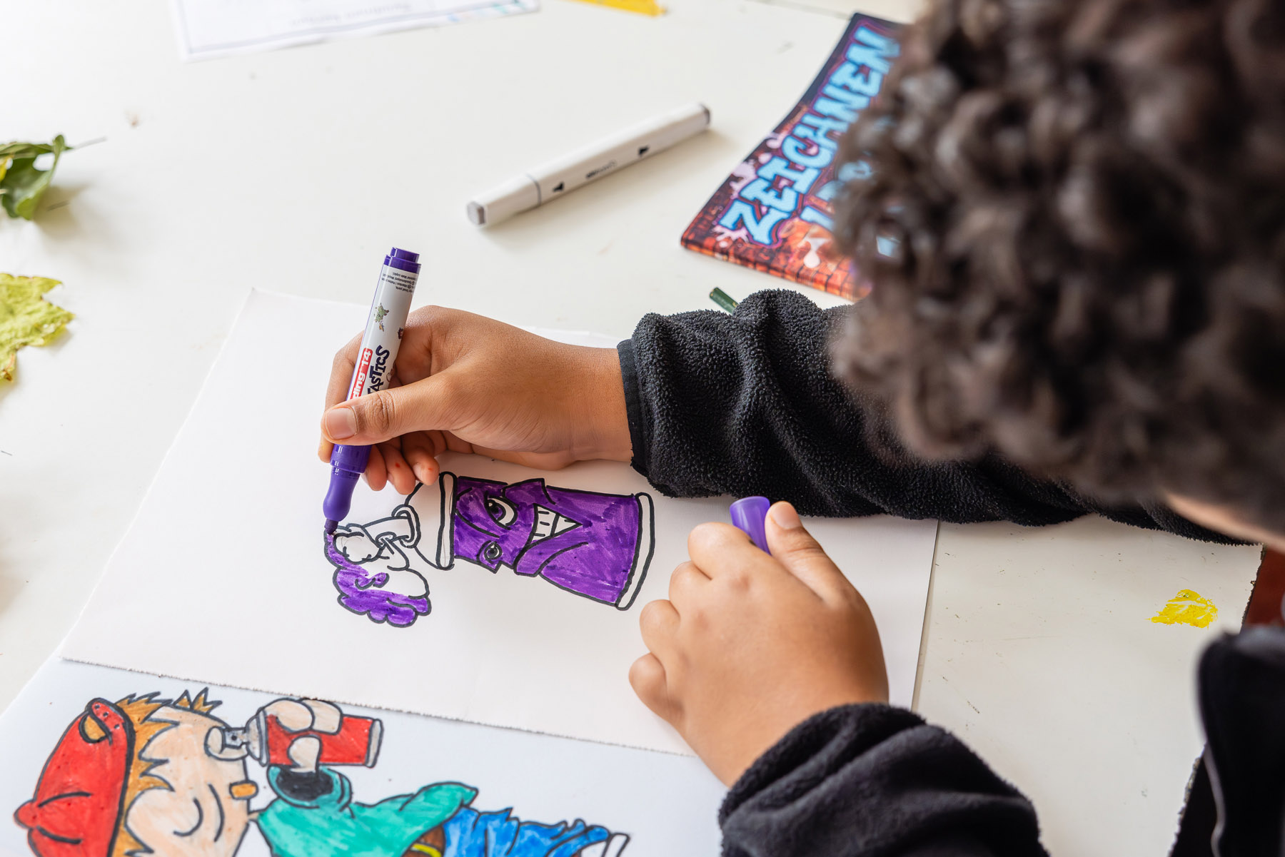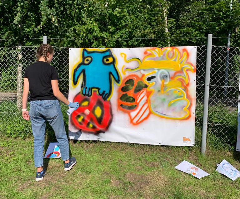 Wir bringen unsere Ideen mit Stiften Edding- und Filzstifte - auf Papier. So können wir uns auch gut überlegen, wie wir das Motiv am besten übertragen. Danach wird unser Motiv an die „Wand“ gesprüht, was in unserem Fall eine aufgespannte Plane sein wird.